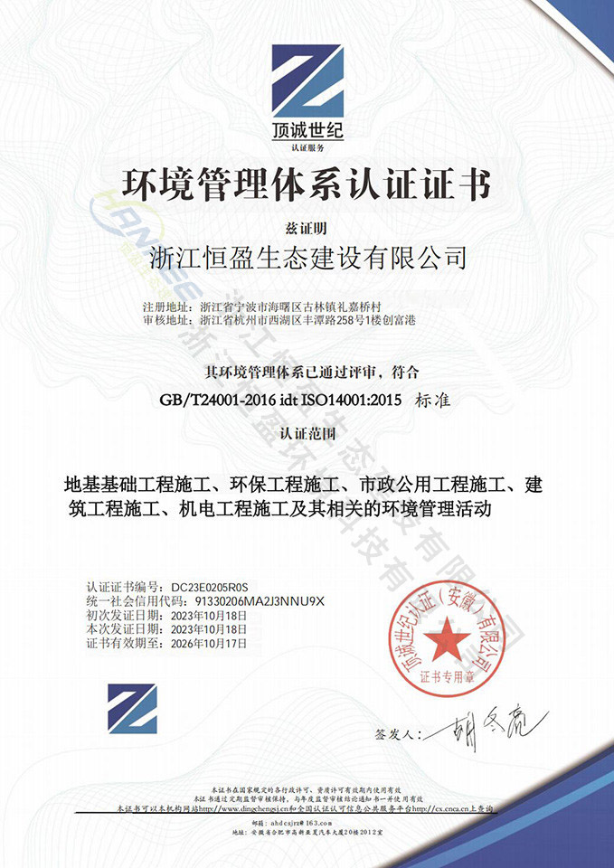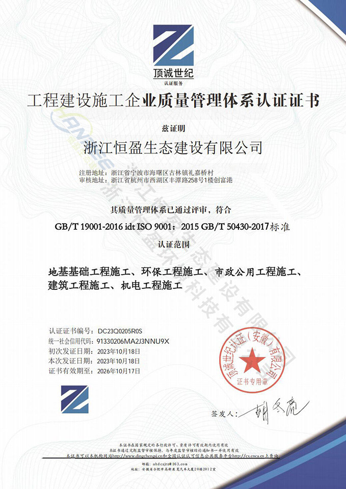 浙江恒盈生態建設有限公司是寧波市環保產業協會會員單位,已取得環保工程專業承包、市政公用工程施工總承包、機電工程施工總承包等多項資質、并已通過了ISO45001、ISO24001、ISO19001多項體系認證。