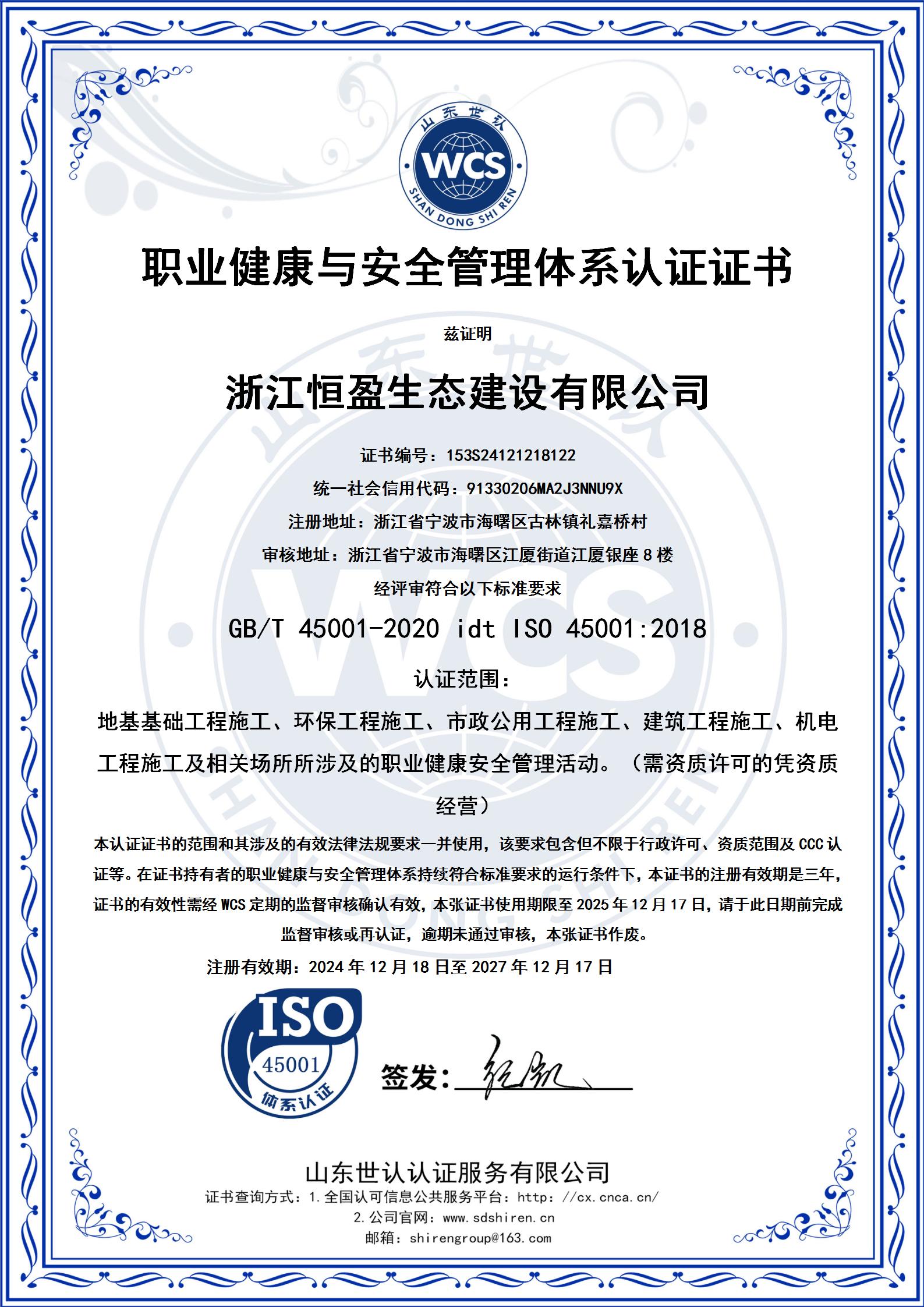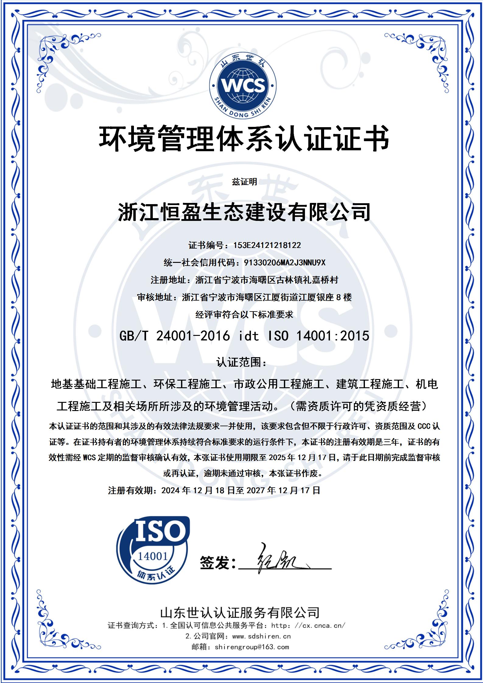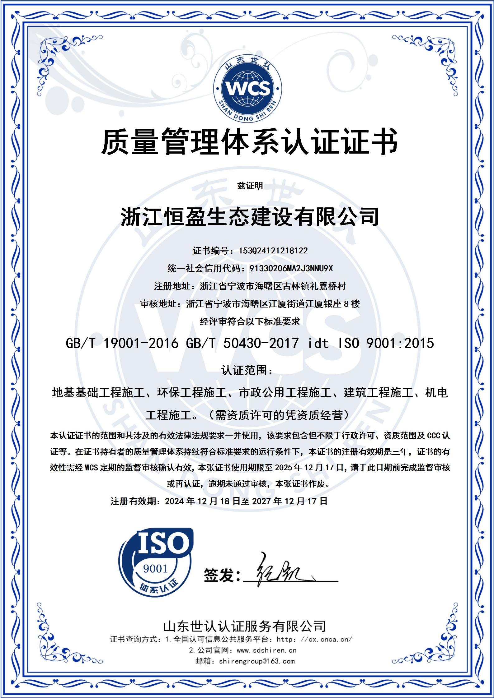 浙江恒盈生態建設有限公司是寧波市環保產業協會會員單位,已取得環保工程專業承包、市政公用工程施工總承包、機電工程施工總承包等多項資質、并已通過了ISO45001、ISO24001、ISO19001多項體系認證。