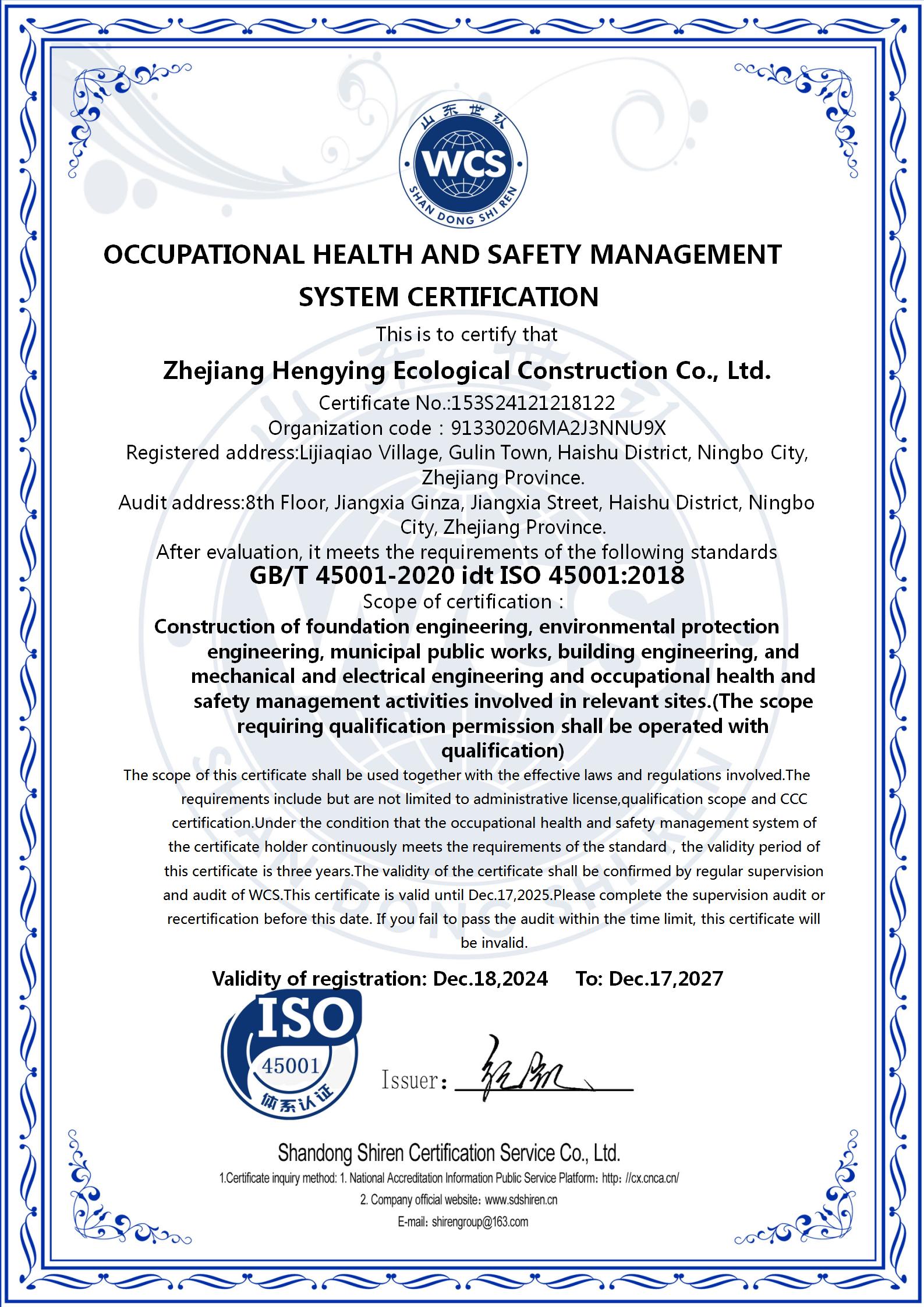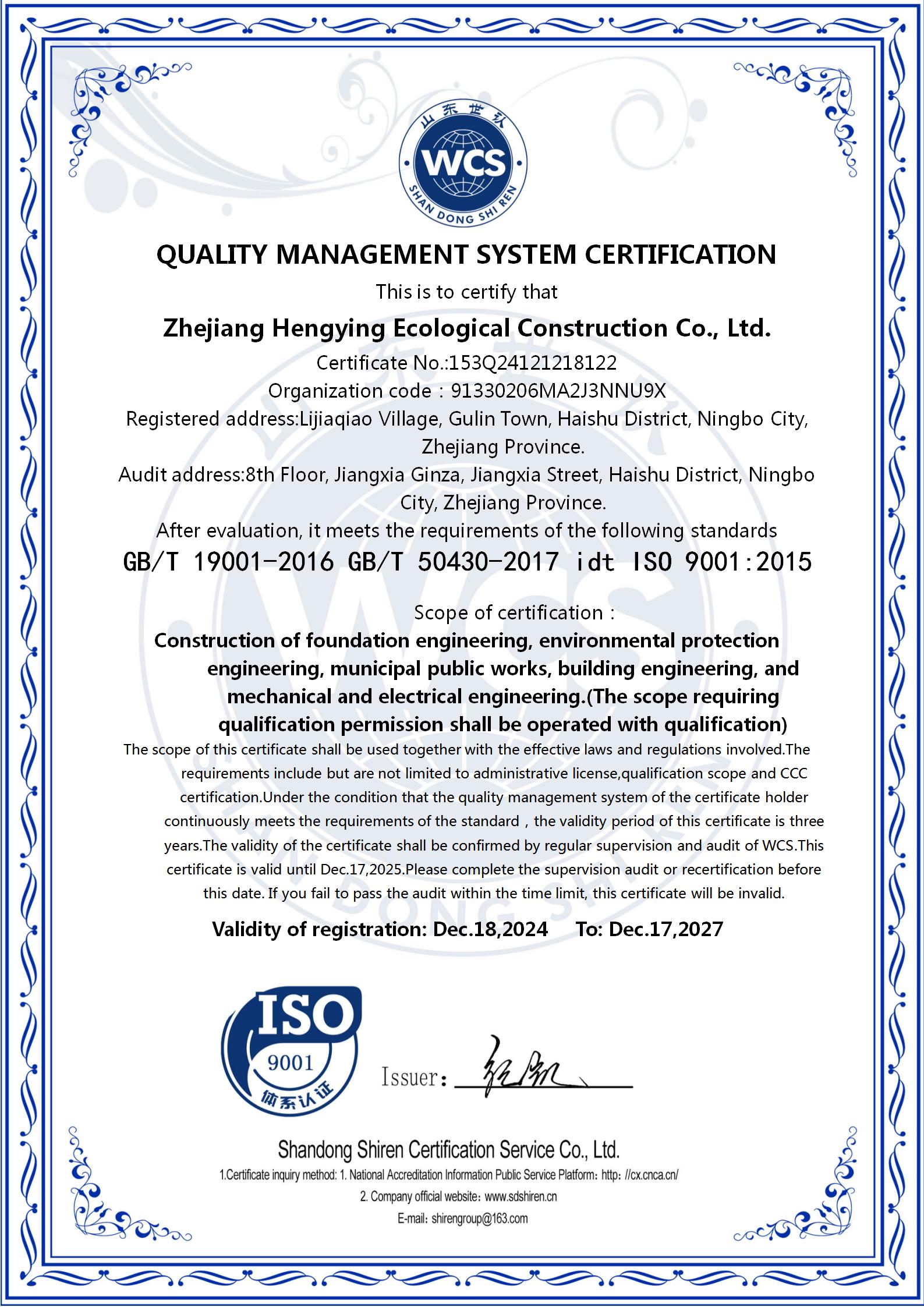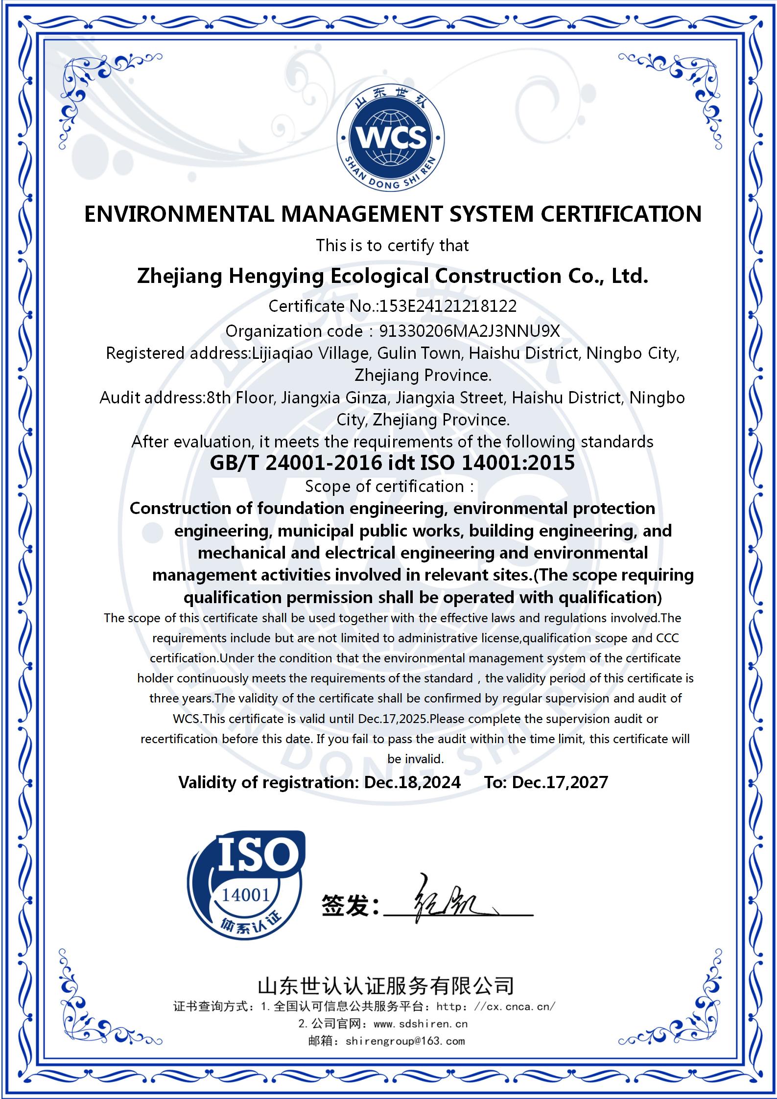 浙江恒盈生態建設有限公司是寧波市環保產業協會會員單位,已取得環保工程專業承包、市政公用工程施工總承包、機電工程施工總承包等多項資質、并已通過了ISO45001、ISO24001、ISO19001多項體系認證。