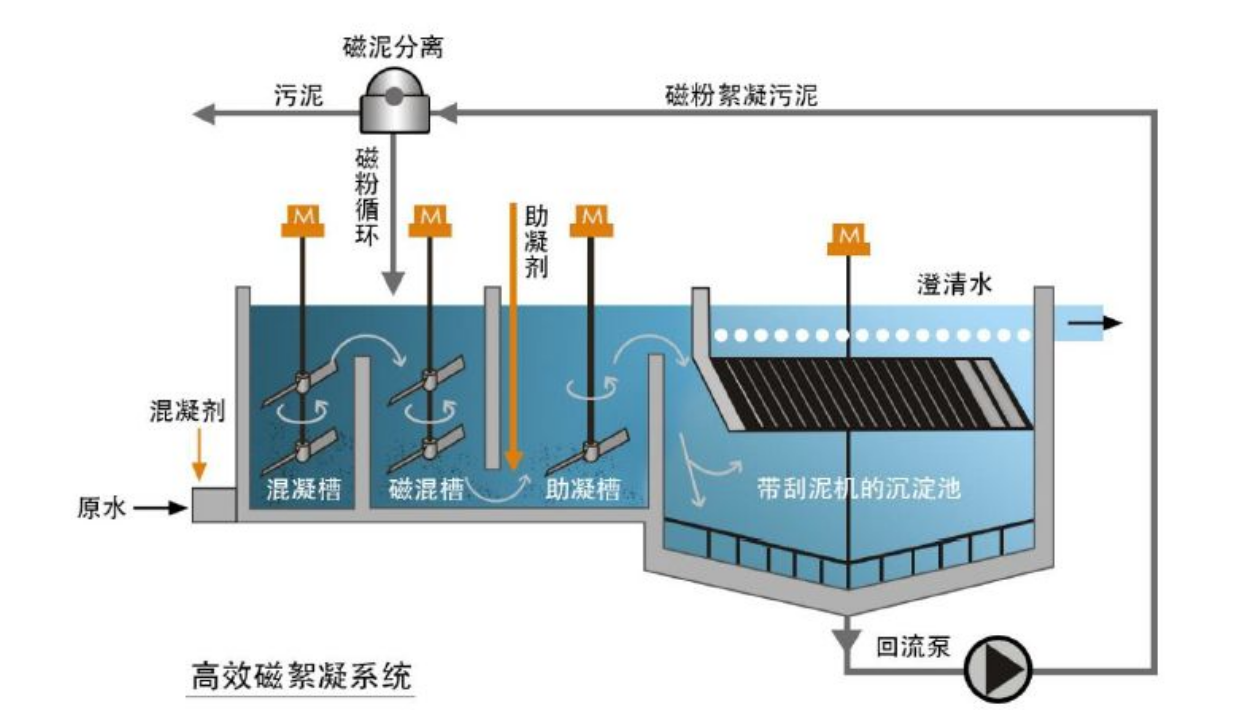 高速磁澄清技術就是在傳統的混凝澄清工藝中同步加入比重為5~6的磁粉,使之與污染物絮凝結合成一體,以加強混凝、絮凝的效果,使生成的絮體密度更大、更結實,從而達到高速沉降的目的。