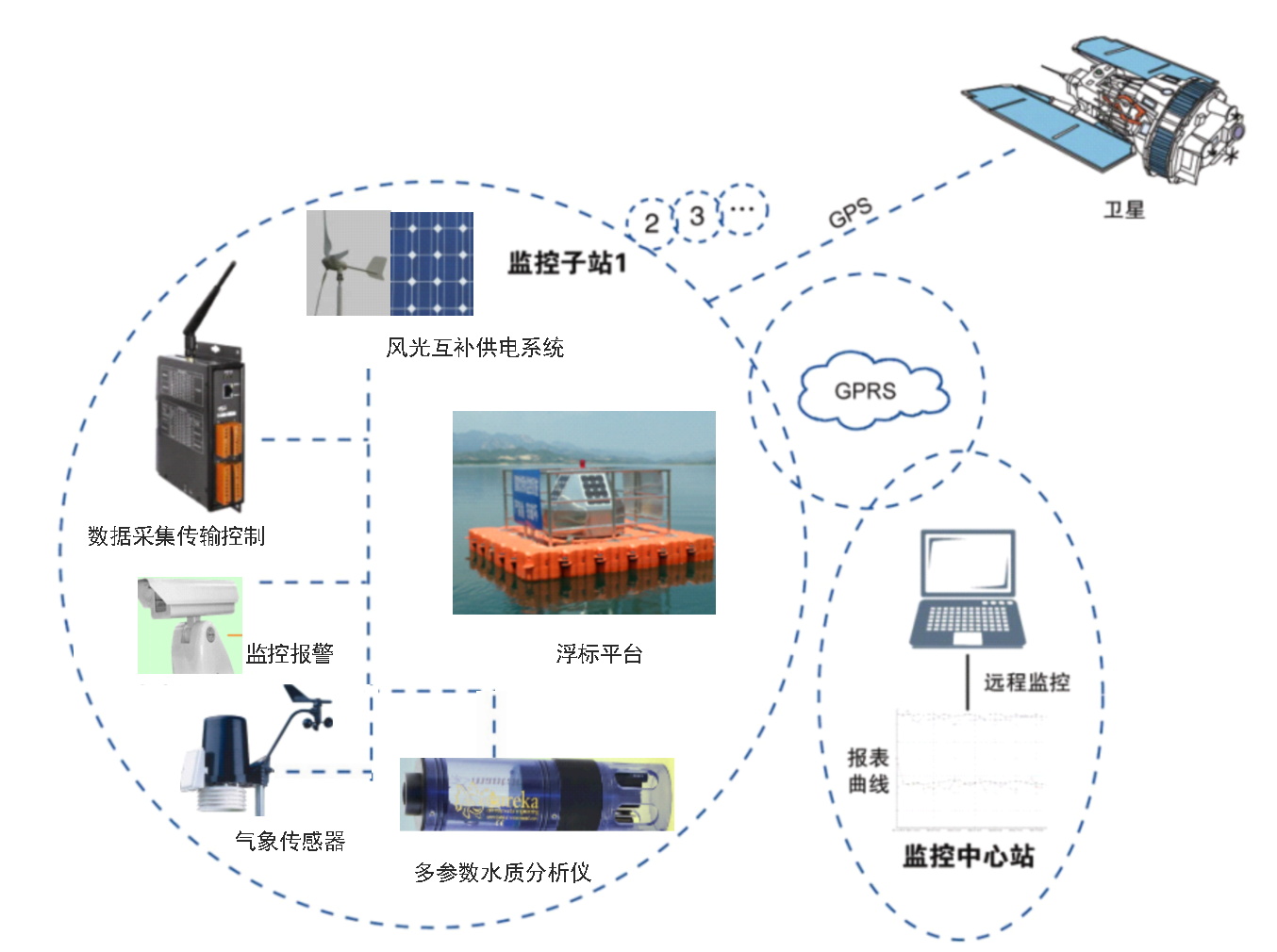 以浮標為載體,搭載若干水質監測設備,實現大面積、長距離、寬斷面的水質多參數在線監測,通過無線傳輸將數據傳輸到后方水質監測平臺,對水源地水質進行綜合監控預警。